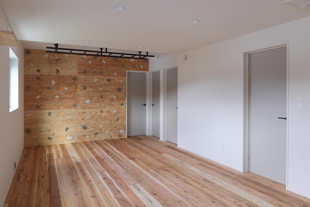 1階はダークウッドとホワイトでシックな雰囲気に。2階はボルダリングと雲梯のあるホールに、共有クローゼットと各個室が並ぶオールキッズスペース。楽しい時間をともに過ごし、思いやりと絆を育む住まいを実現したのはタニミズでした。